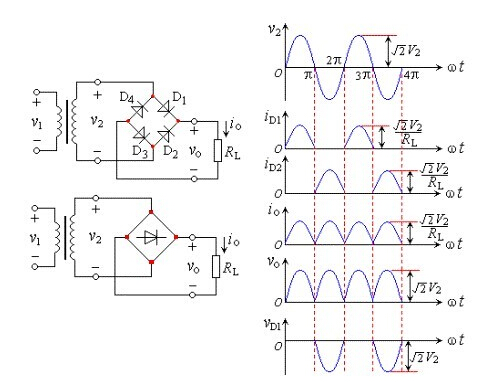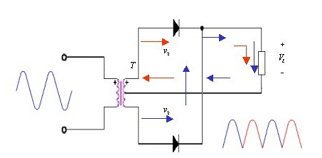 全波整流電路:利用副邊有中心抽頭的變壓器和兩個(gè)二極管構(gòu)成如下圖所示的全波整流電路,從圖中可見(jiàn),正負(fù)半周都有電流流過(guò)負(fù)載,提高了整流效率。