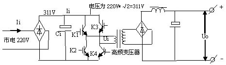 由電路可以看出,市電經整流濾波后變為311V高壓,經K1~K4功率開關管有序工作后,變為脈沖信號加至高頻變壓器的初級,脈沖的高度始終為311V。當K1,K4開通時,311V高壓電流經K1正向流入主變壓器初級,經K4流出,在變壓器初級形成一個正向脈沖,同理,當K2,K3開通時,311V高壓電流經K3反向流入主變壓器初級,經K2流出,在變壓器初級形成一個反向脈沖。這樣,在變壓器次級就形成一系列正反向脈沖,經整流濾波后形成直流電壓。當輸出電壓Uo較高時,脈沖寬度就寬,當輸出電壓Uo較低時,脈沖寬度就窄,因此開關管實際上是一個控制脈沖寬窄的裝置。